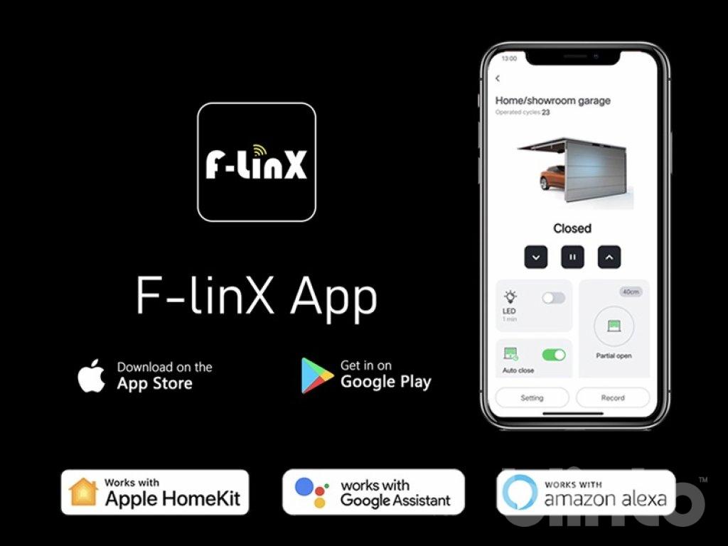 Garagemotor öppnare med inbyggd WiFi-modul för att möjliggöra kontroll och drift med F-LinX App som finns att ladda ner i Apple App Store och Google Play