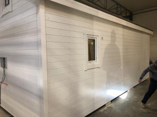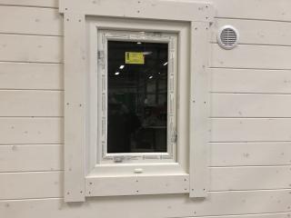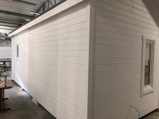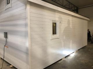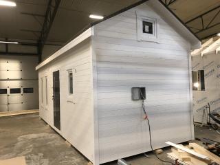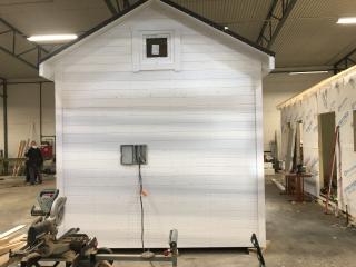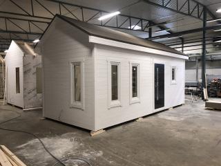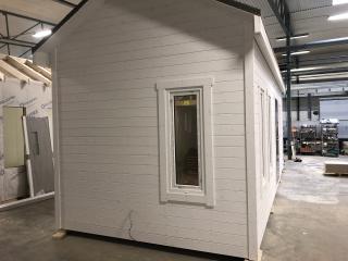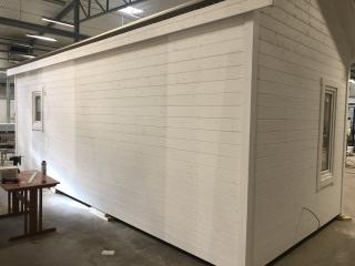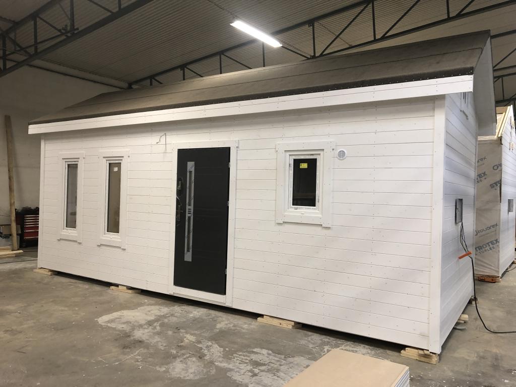 Taket där ligger takpapp men förslagsvis lägger man pannor när huset står på plats.