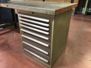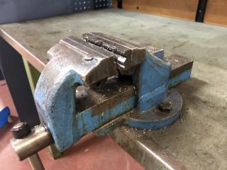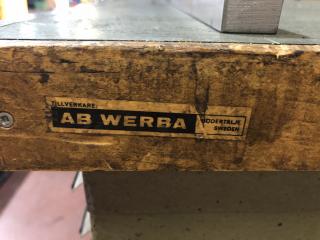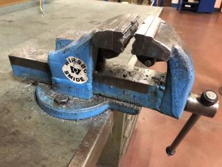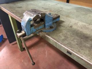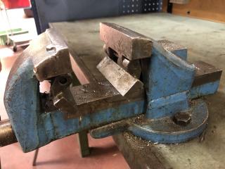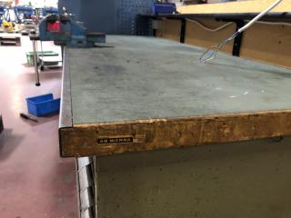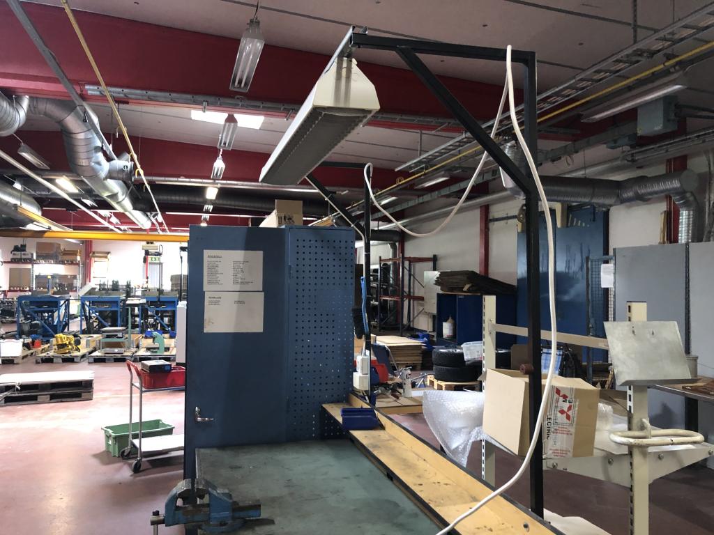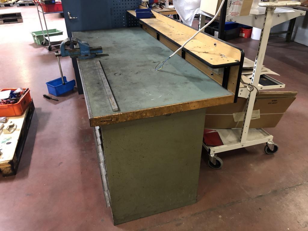Arbetsbänk med belysning. Ingår ett Wisbo smide skruvstäd och en hurts, se bild. Transportmått (mm): ca 2000x800x850 Säljes i befintligt skick.