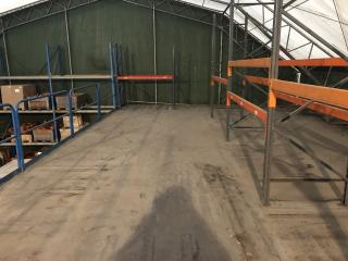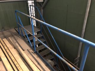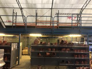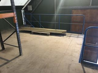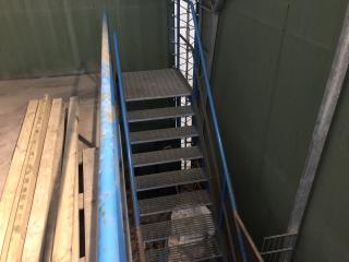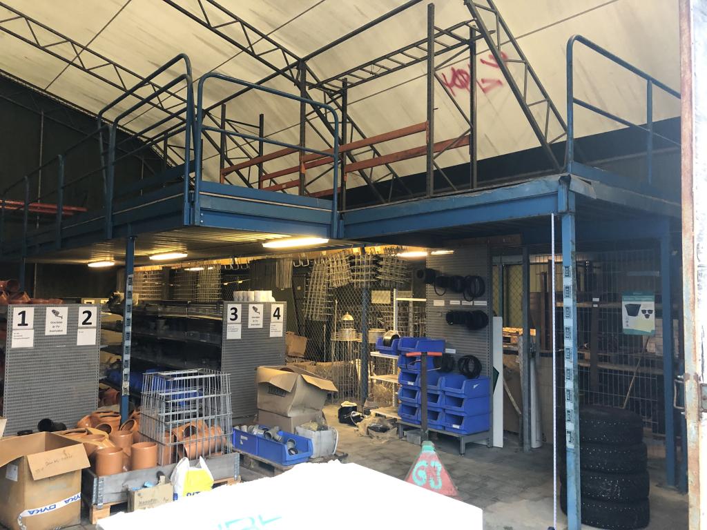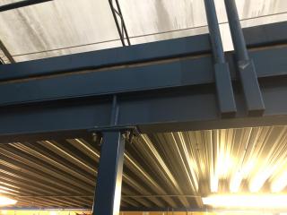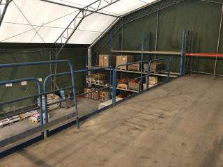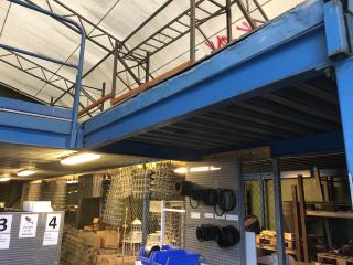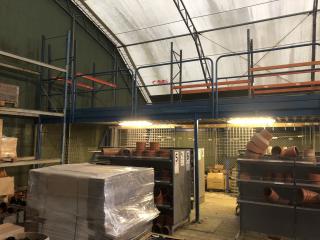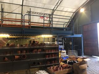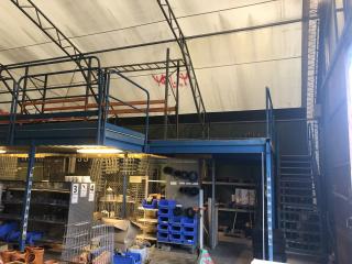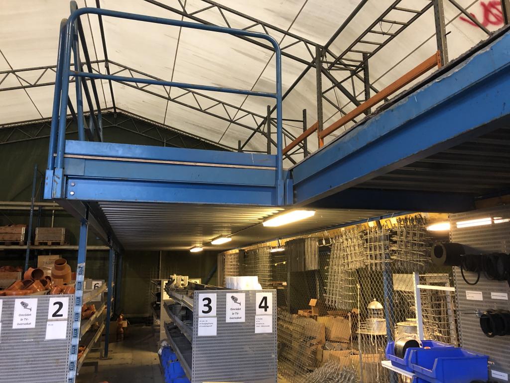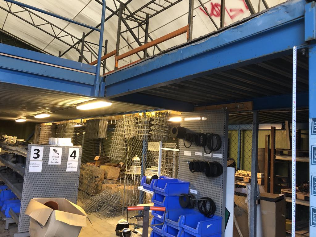 Entresolplan i gott skick och komplett. Mått: Längd: ca 15.70m (inklusive trappans bredd på 1meter) Bredd: ca 7.10m Höjd: ca 2.50m. Ingår: 6 lampor. Obs. Lagerhyllorna ingår ej, se bild. Nedmonteringen görs av köparen, då ritning saknas.