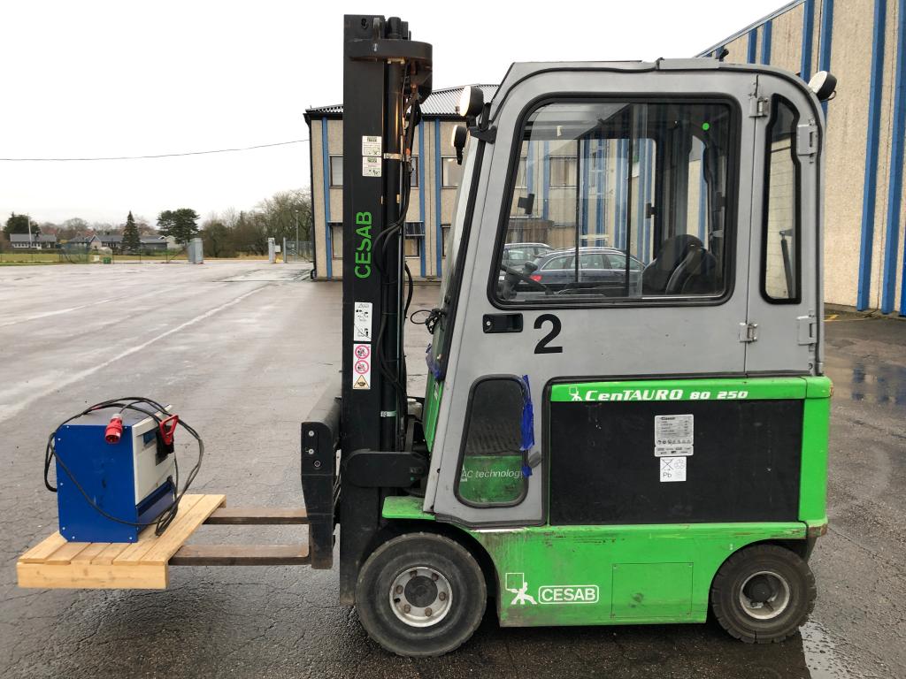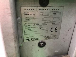 Eltruck 2,5 ton Modell Cesab centauro 80 250 Årsmodell 2013 , 5625 timmar 2,5 ton , 80 amp , laddare medföljer Lyfthöjd 5,40 , gaffellängd 1,20 Gaffelspridning & gaffelförskjutning & tillt Värme i hytten Däck fram 23x9-10/6 Däck bak 18x7-8 Fungerande brukskick Spräckt vindruta Lasthjälp finns på plats dagtid Höjden på stativet i nedsänkt läge är 2400 mm.