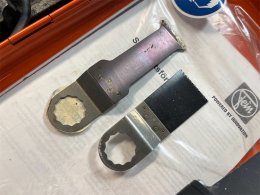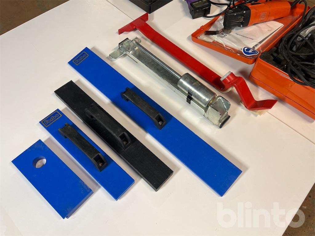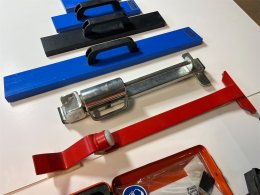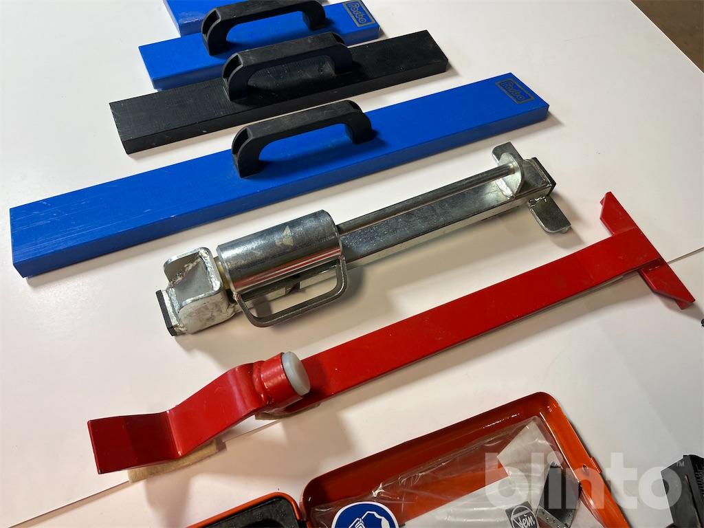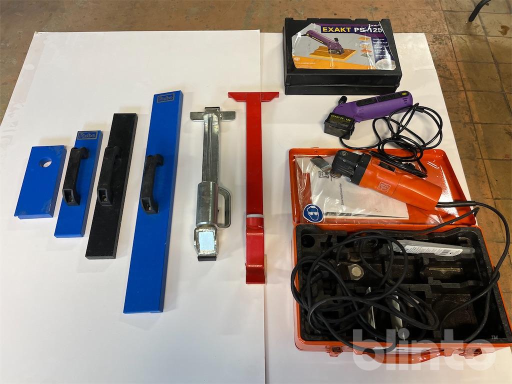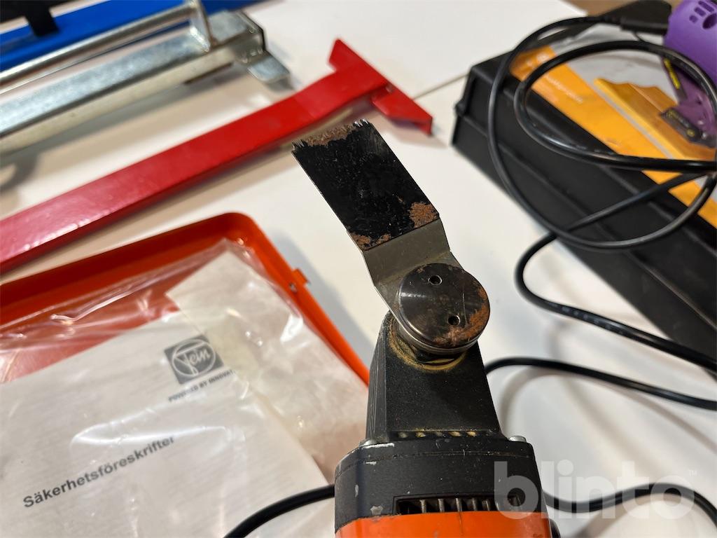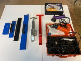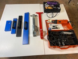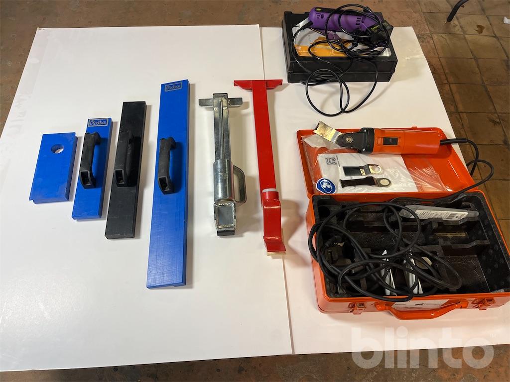 Diverse verktyg för läggning av parkett / trägolv. En multisåg samt en händig mini sågklinga för trä / keramik och metall. Utöver detta diverse slagverktyg för golvläggning.
