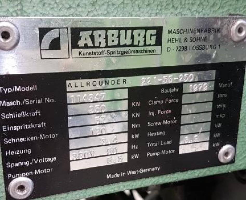 Formsprutningsmaskin ARBURG 221-55-250 Fungerande maskin. Årsmodell 1979