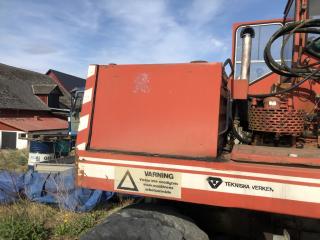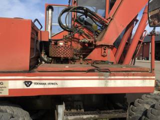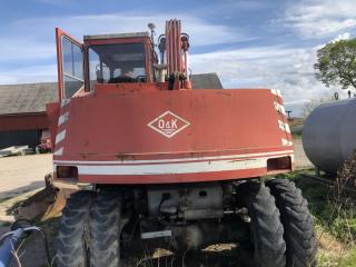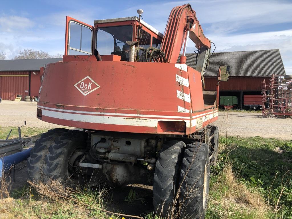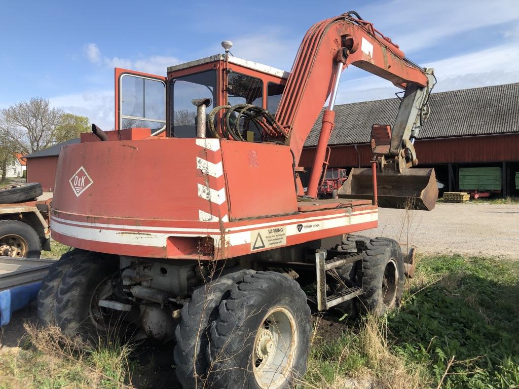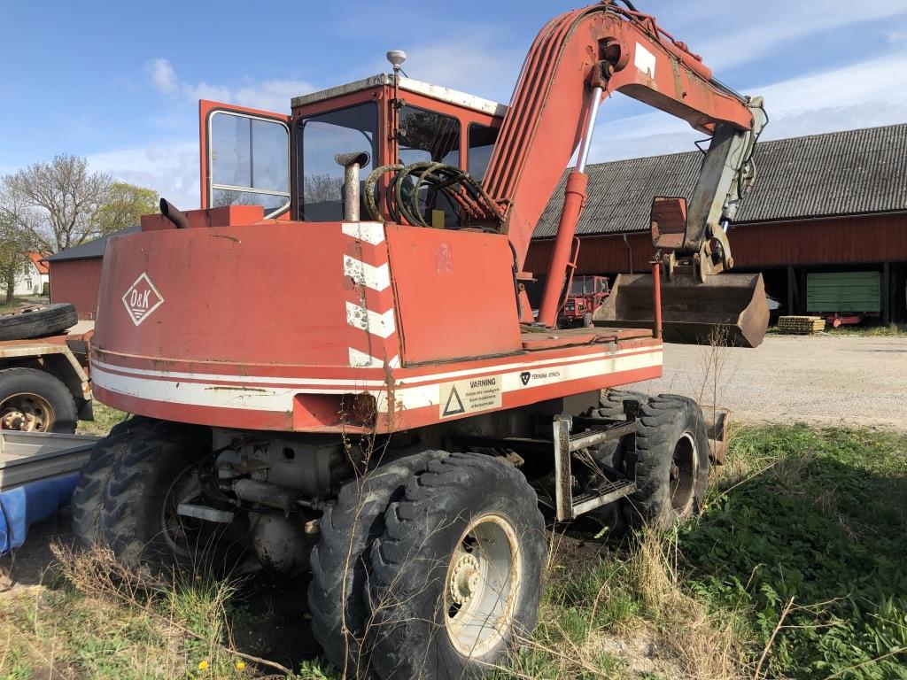 Grävmaskin O&K MH 4 Årsmodell 1979 Timmar 9092 Bromsar lufthydralik Torrsprickor i däcken Boforsfäste B18 mek Skopa har små hål Bredd skopa 1,50 m Djup skopa 0,60 m