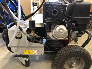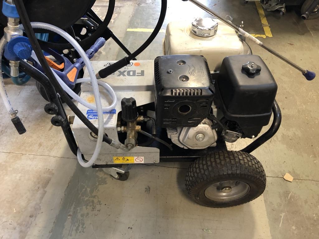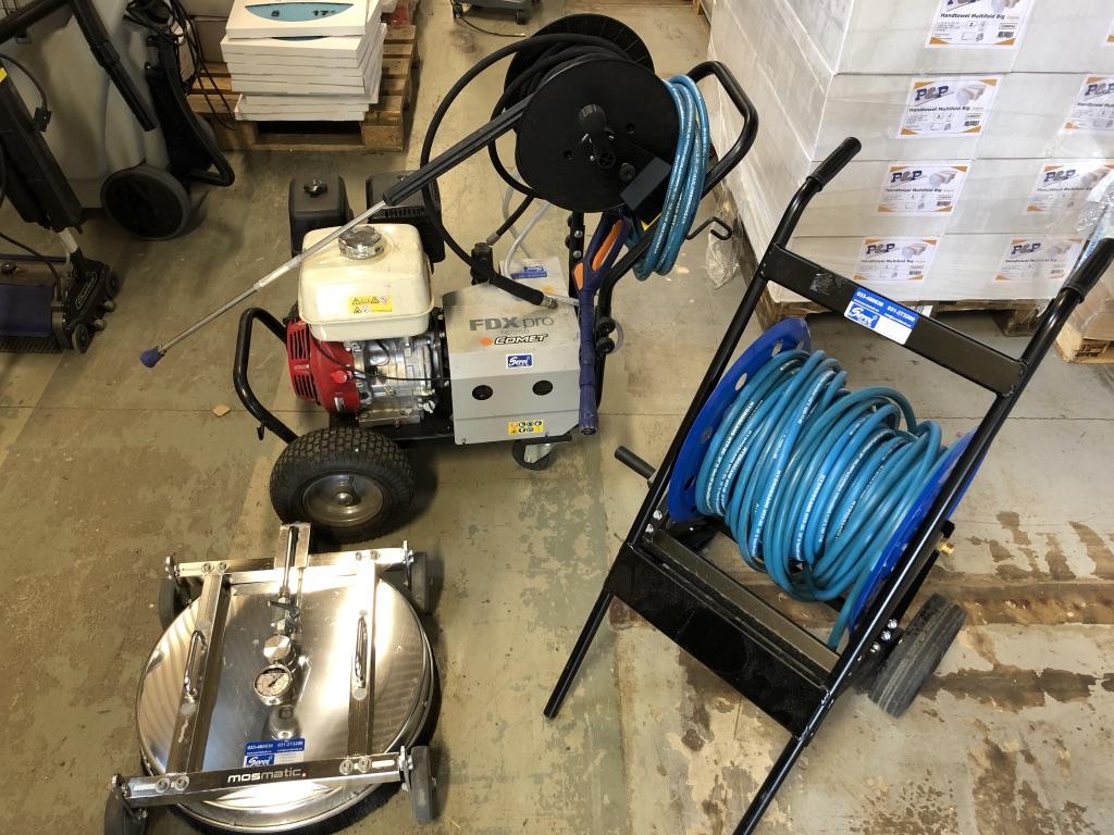 Nästan ny bensindriven högtryckstvätt, endast demo.använd. Modell: FDX PRO Motor: Honda GX, bensin Maxtryck: 250bar, flöde 16L/min Vagn, där främre hjulen är lufthjul detta för enklare kunna transportera tvätten. Bakren hjulen är styrhjul, för enklare framkomlighet i trånga utrymmen. Slangvinda med 10 meter tillhörande slang. Övriga tillbehör: -Slangvinda med vagn och 40 meter slang. -Taktvätt i rostfritt, för effektiv rengöring av bla mossa. Justerbar höjd, för olika tak. Justerbara hjul i sidled. vikt 14.5kg Använd några få gånger.