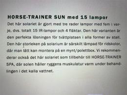 Det här solariet är gjort med tre rader lampor med fem i varje, dvs. totalt 15 IR-lampor och 3 fläktar. Den här varianten är den perfekta lösningen för tvättplatsen i alla former av stall. Den här storleken på solarium är särskilt lämpad för ridskolor, där man lätt kan montera på en mynt/polettbox som gör det möjligt att finansiera användningen av solariet.