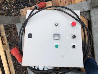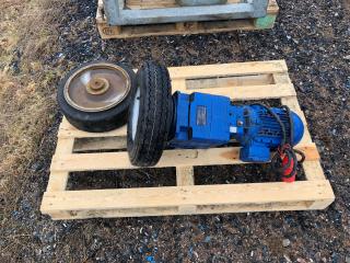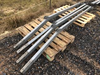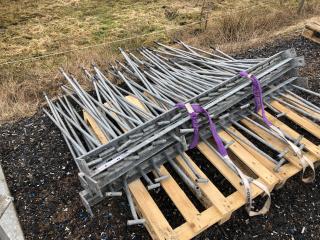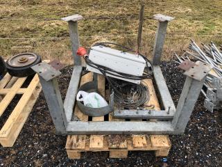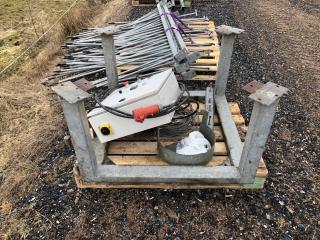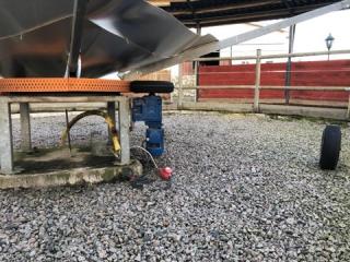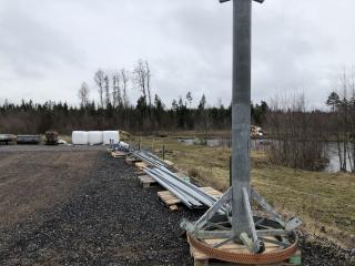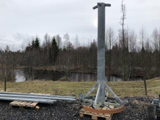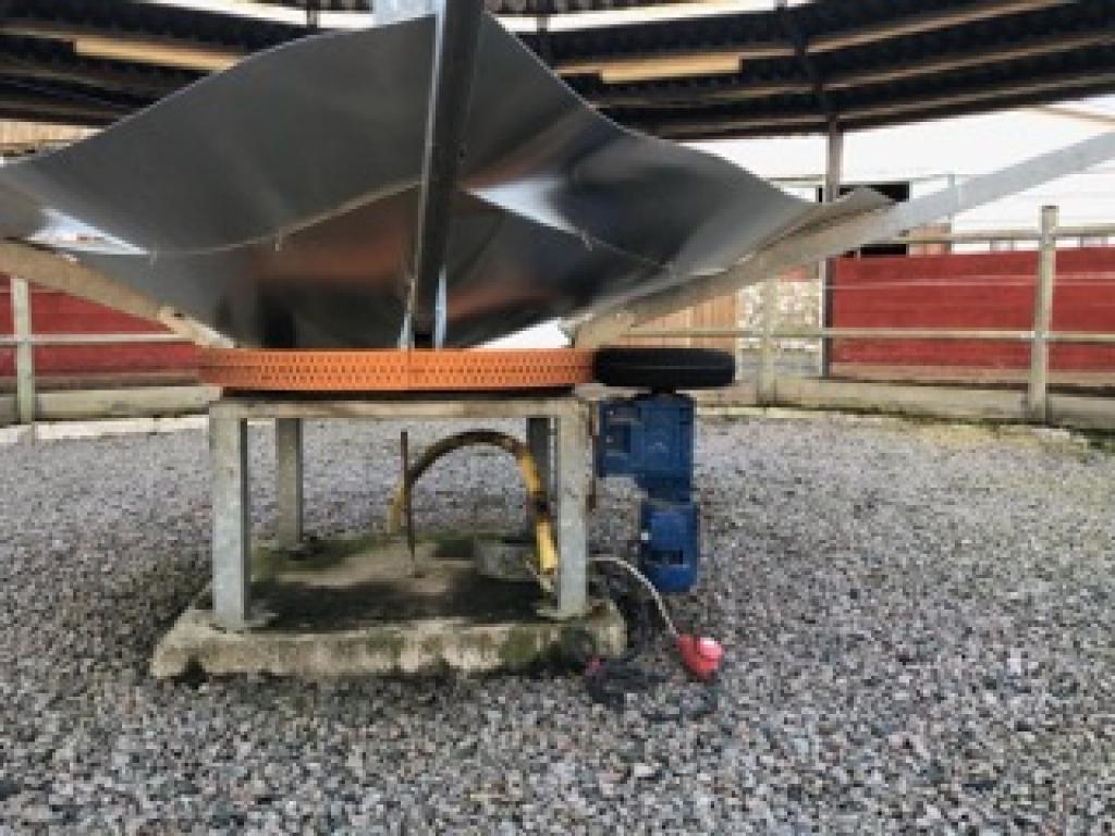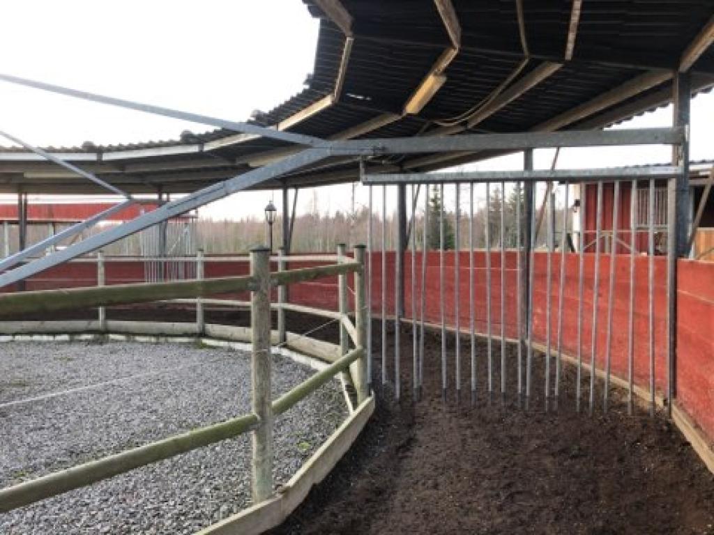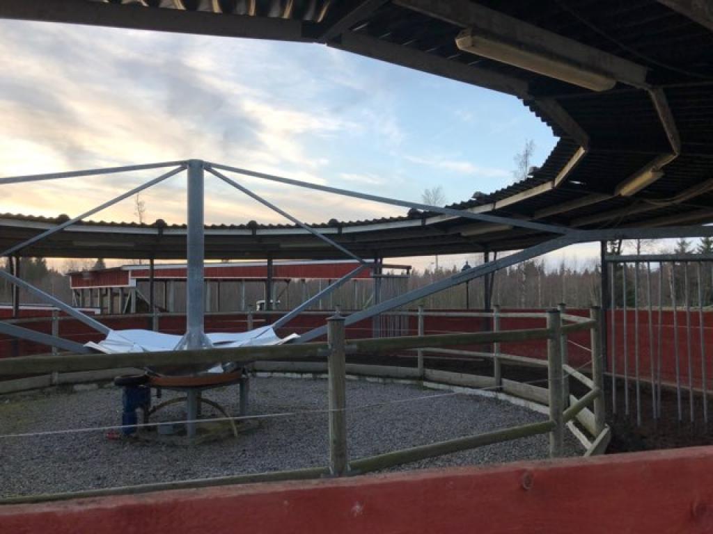 Komplett Skrittmaskin för 4 st. hästar. Ringens ytterdiameter: 14,7 Meter. Ringens innerdiameter: 10,0 Meter. Galvat stål. Bevi elmotor HU 80C 91S4. Löphjul massivt gummi. Styrskåp, 3-fas. Lager till svängkrans defekt ! OBS! De första bilderna är ifrån när skrittmaskinen var monterad. Nu är den nermonterrad och klar för avhämtning. Taket medföljer ej.