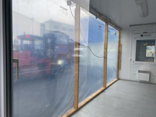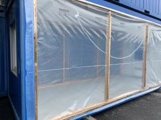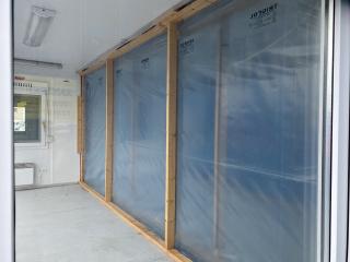Utrustad med element, takbelysning, 230 uttag, samt skydd för rutorna.