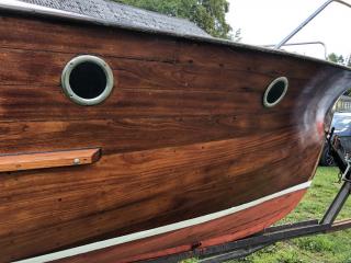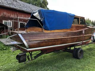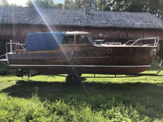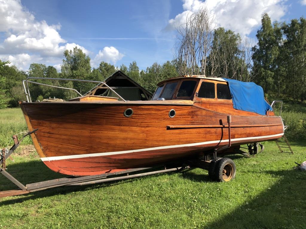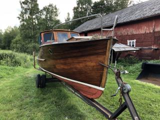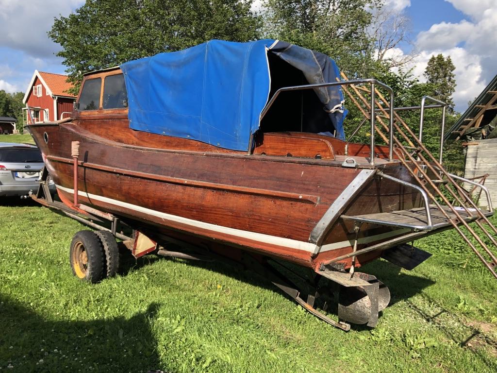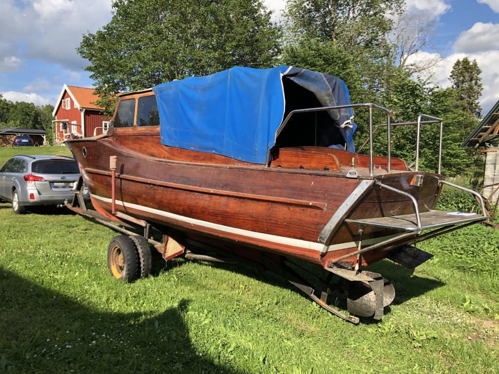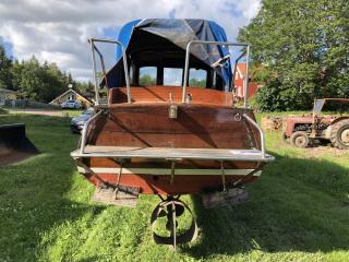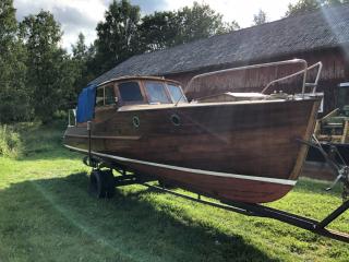 En vacker båt i mahogny Längd: 8,5 meter inkl. badbrygga Bredd: ca 2 meter År: 50-60 tal Troligen en Oxelö Ny bränsletank i rostfritt på ca: 100 liter Nyare el och instrument Har stått på land i 3 år inne under tak. Kapell är helt med en dragkjedja som inte vill hela vägen Motor är en defekt Opel-disel vars topplock saknas Två sista bilderna från när hon sist låg i sjön Båttrailern på bilden ingår i köpet.