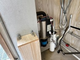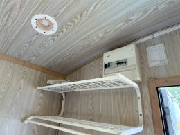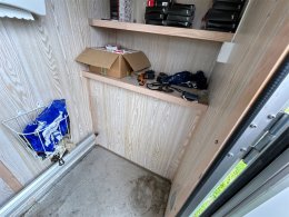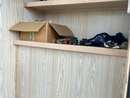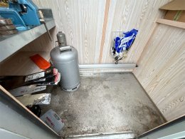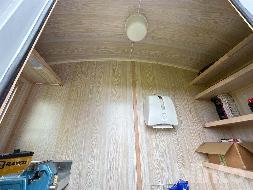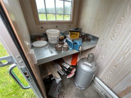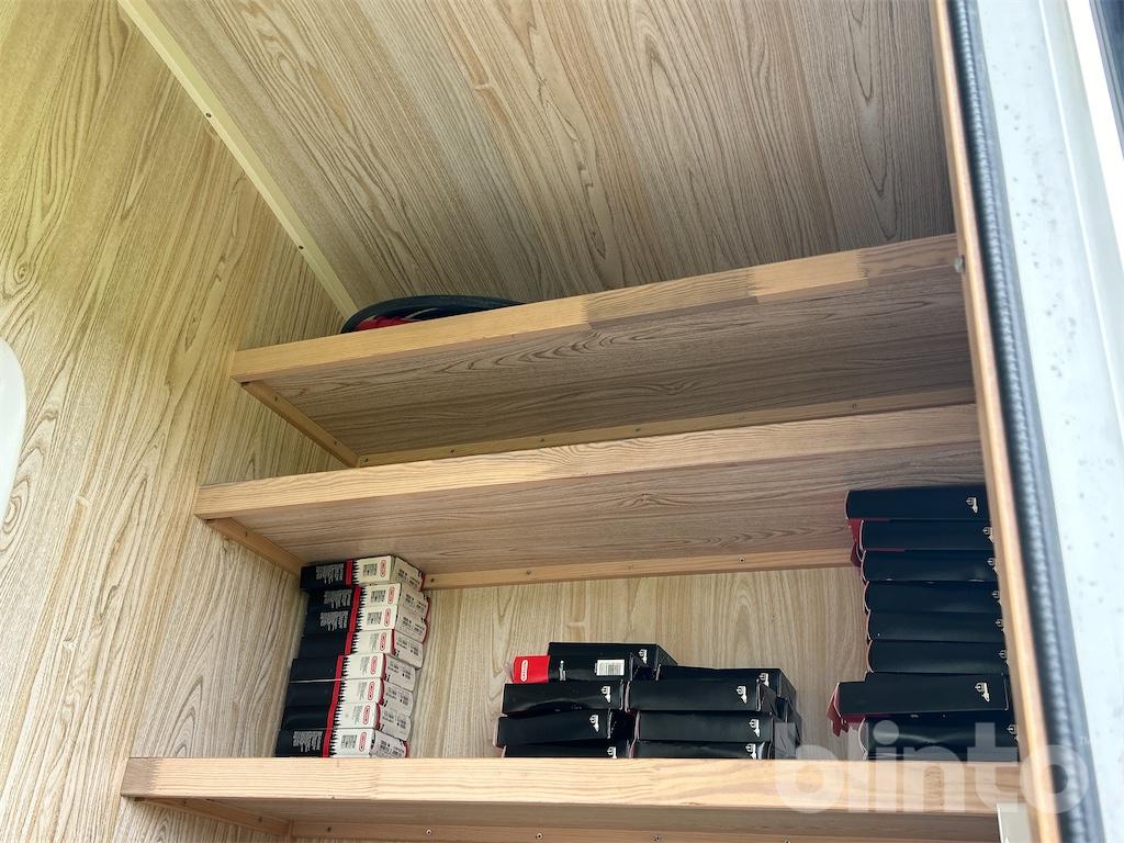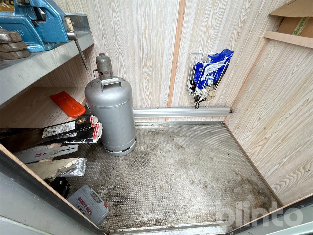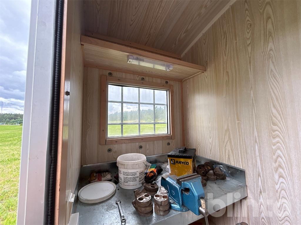 Verkstad baktill med arbetsbänk och hyllor