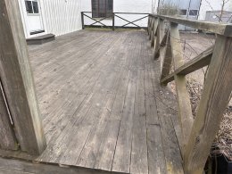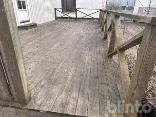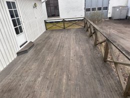 Hängrännor, ventilationsanläggning, altan med räcke.
