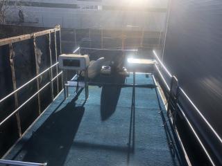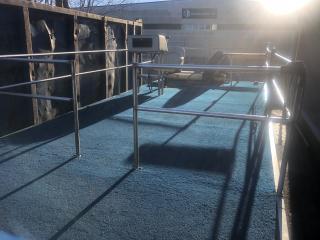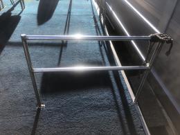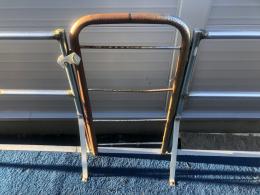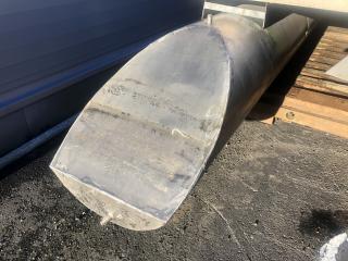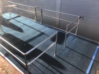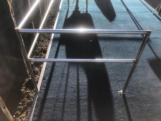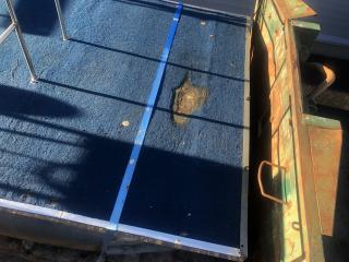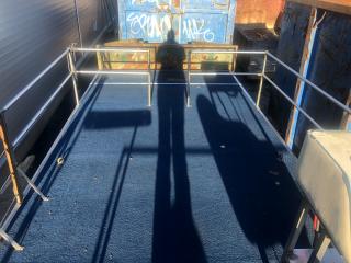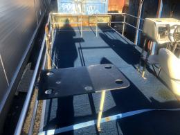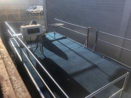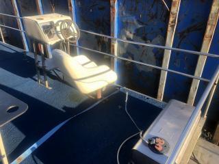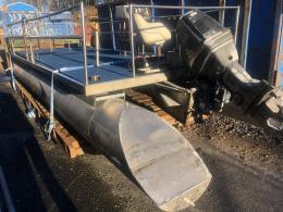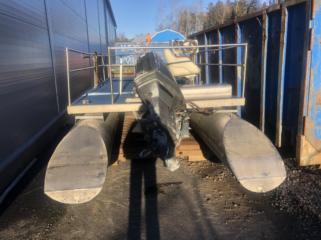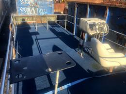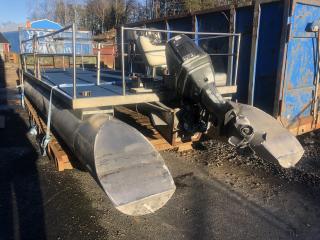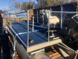 Består av stålram med träbotten och 4 mm rostfria stålpontoner.