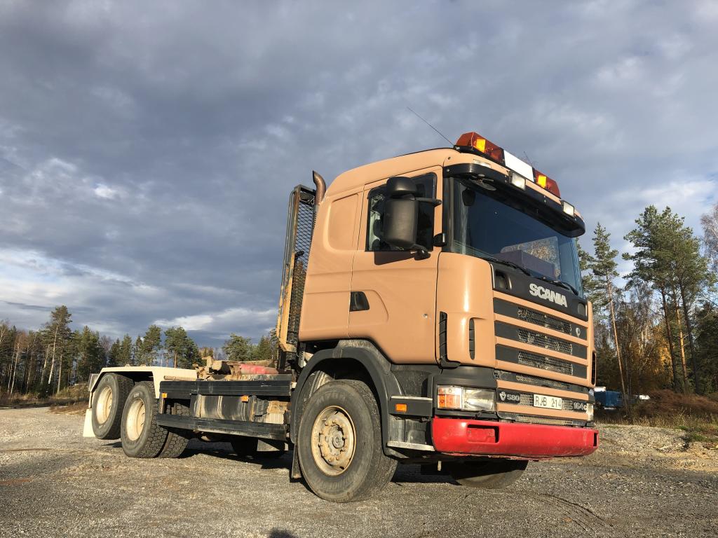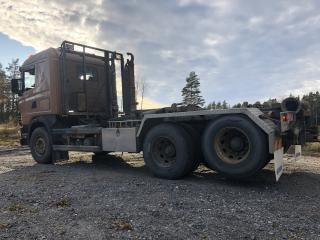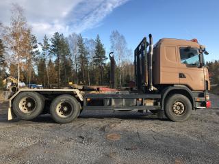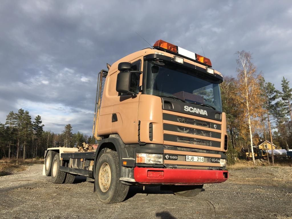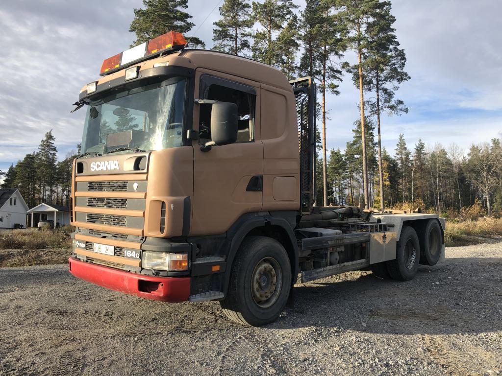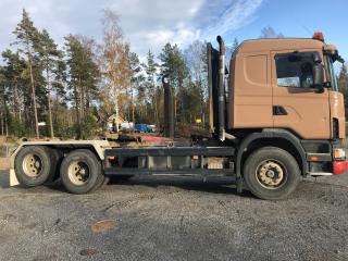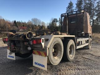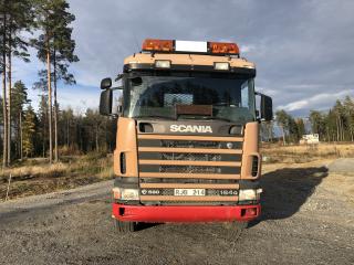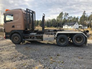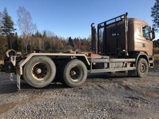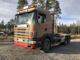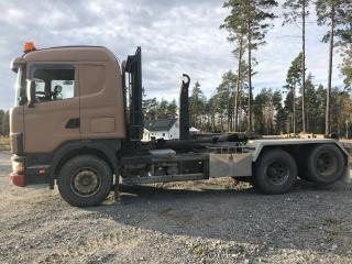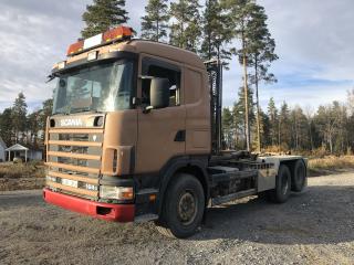 SCANIA R144GB6X2NZ460 Lastväxlare med två flak som medföljer. Årsmodell: 2000 Modell: R144GB6X2NZ460 Motoreffekt: 461hk / 339kW Drivmedel: Diesel Växellåda: Manuell Fyrhjulsdrift: Nej Import: Nej - Tipphudraulik bak - Extra duo-matic för spridarlucka - Värme - Dieselvärmare - funktion osäker - Hiab multilift - Centralsmörjning finns - funktion osäker Mått & Vikt Längd: 8200 mm Bredd: 2540 mm Tjänstevikt: 11640 kg Totalvikt: 27000 kg Lastvikt Max: 15360 kg Axelavstånd Max: 4300 mm Däck fram: 315/80R22.5 Däck bak: 295/80R22.5 Tillbehör: Gult flak 2,40 m bred 6,70m långt - befintligt skick Blått flak 2,50 m bred 5,80 m långt - befintligt skick Ej godkänd besiktning - Besiktningsprotokoll (se bild)