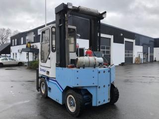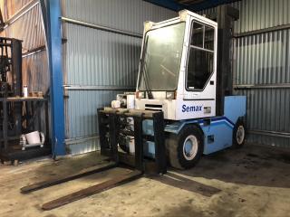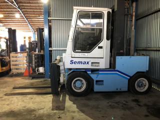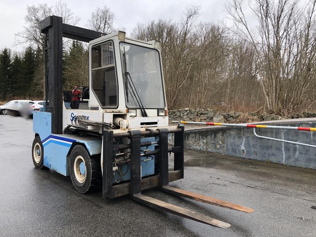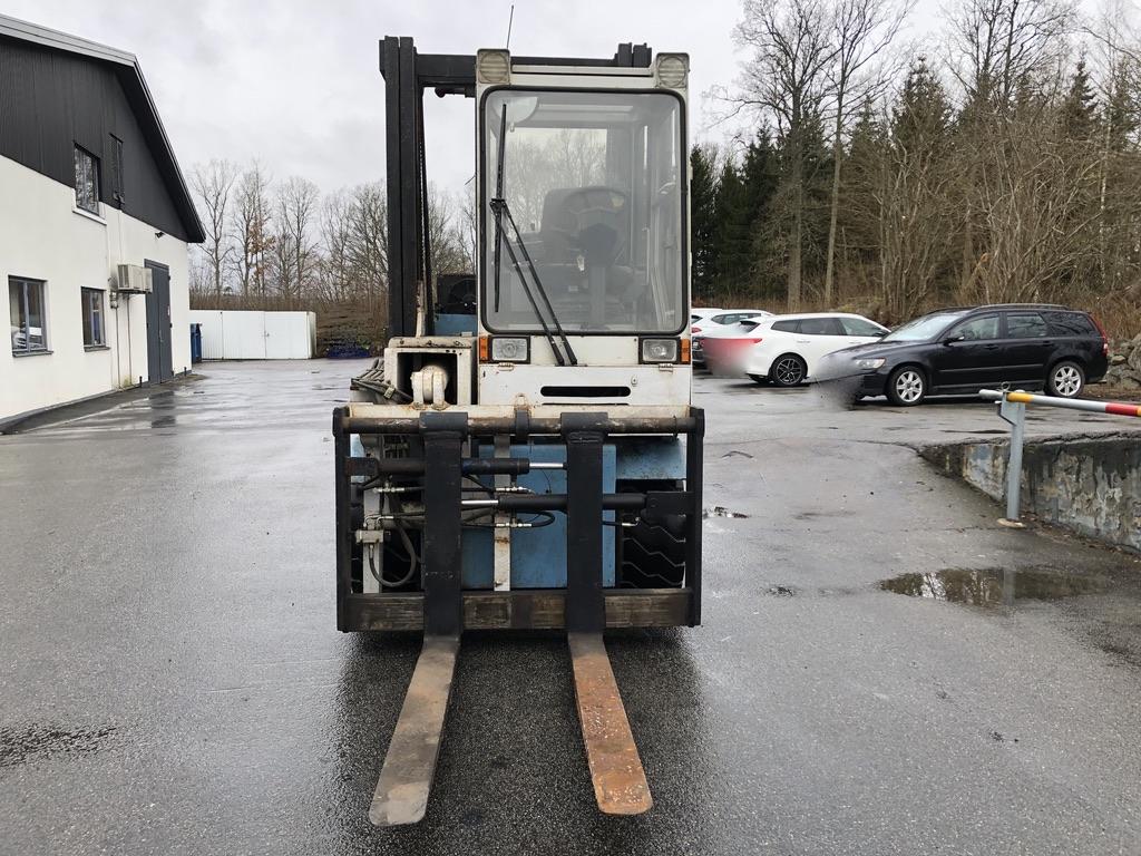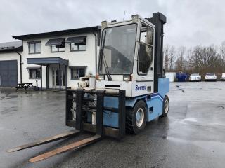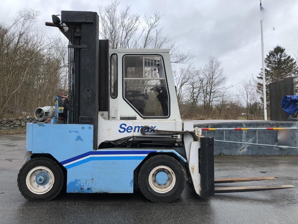 Fullt fungera gasoldriven motviktstruck med V8. Fabrikat: Semax Modell: 6000G Tillverkingsår: 1995 Driftstimmar: 6836h Tomvikt: 9700kg Stativtyp: Duplex Lyftkapacitet: 6000kg Lyfthöjd: 4000mm Stativhöjd: 3130mm Hydrauliskt utskjut 0-900mm, vid fullt utskjut är lyftkapaciteten 3200kg(exklusive ev gafflar/balklämma) Trucklängd utan gafflar: 3100mm Truckbredd: 1650mm Motor: GM-V8-gasol Transmission: Hydrostat drivning Rexroth Servoassisterande våta lamellbromsar Automatisk parkeringsbroms