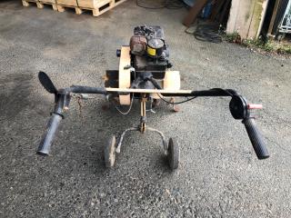 Briggs Stratton på 5 Hk. Startar och går, men i behov av ny drivrem.