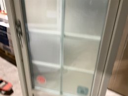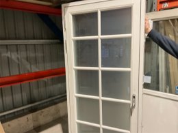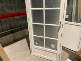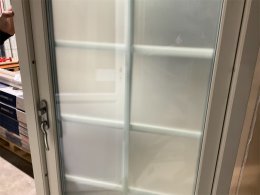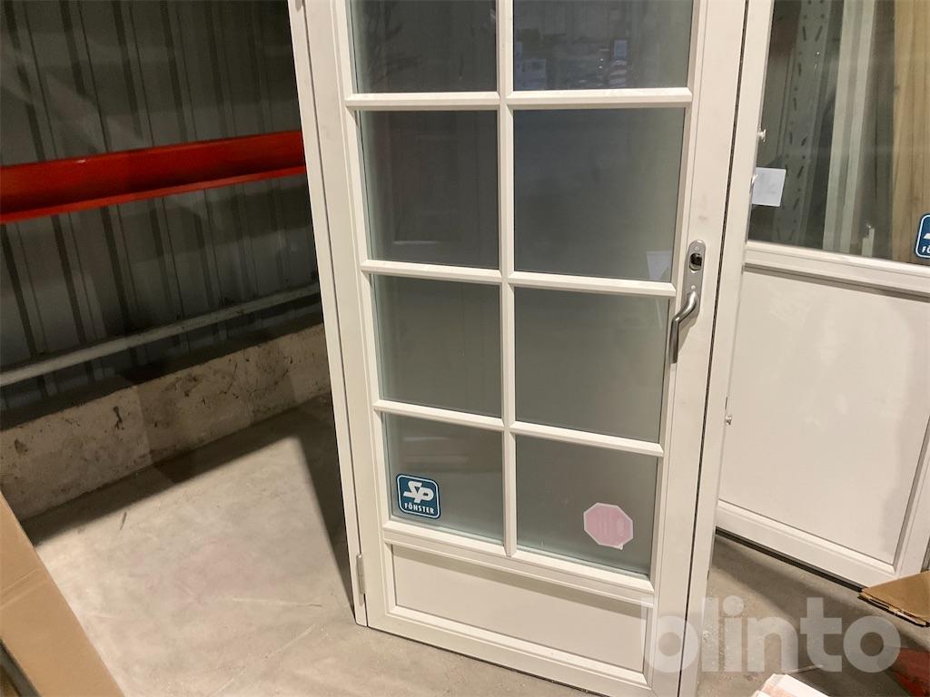 En spröjsad altandörr med frostatglas och låg tröskel.