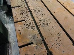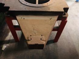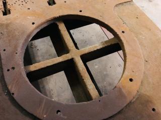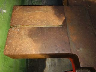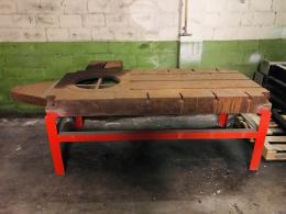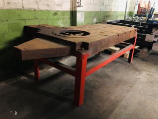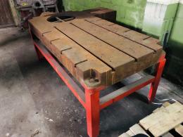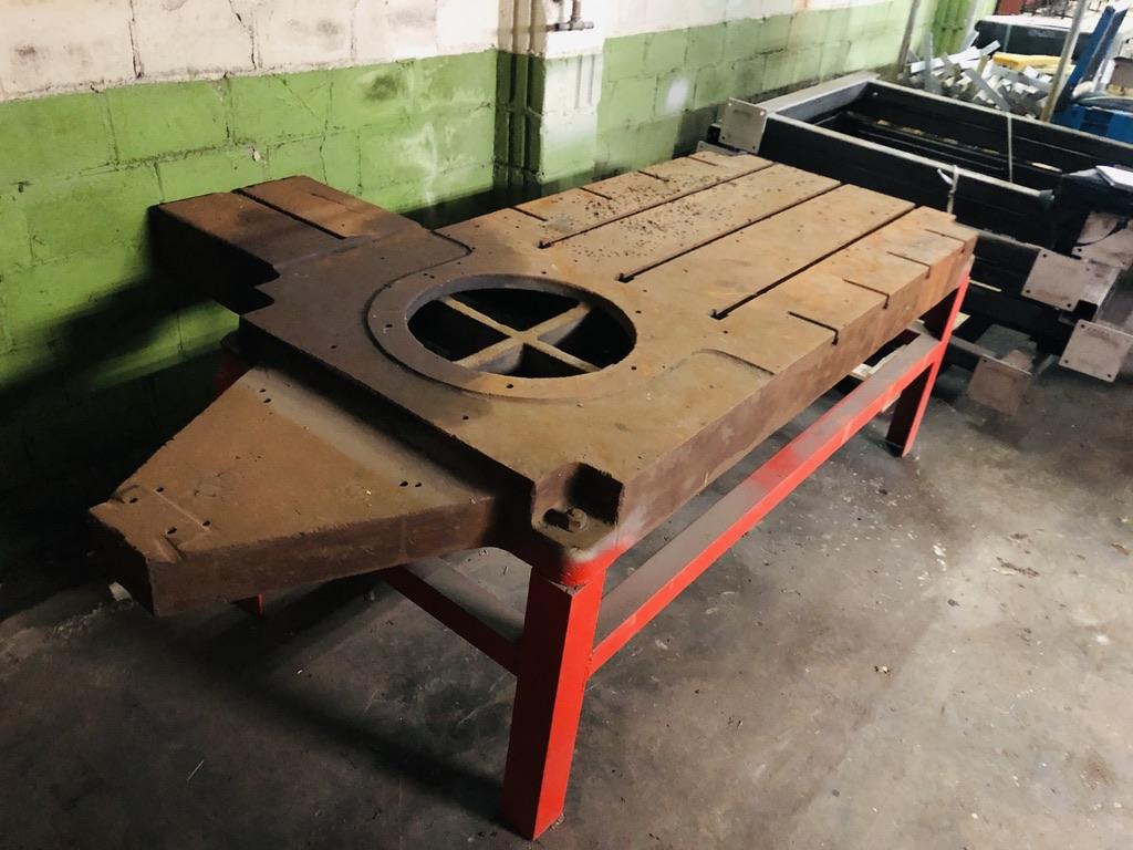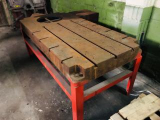 Ett verkstadsbord med gjuten platta med spår för spårskruv