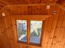 Längd: ca 3850 mm, taket går ut ca 140 mm på varje gavel