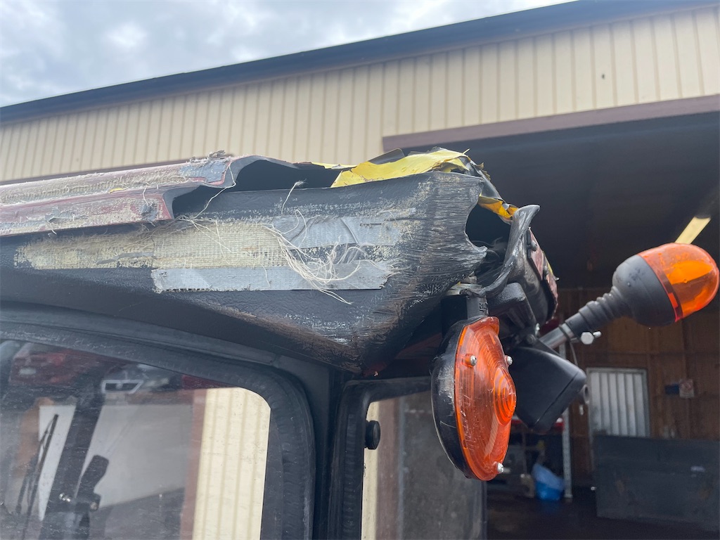 Skada på takets högra bakre hörn, dörren saknas
